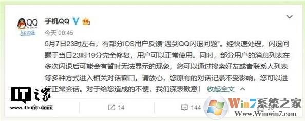 QQ方面对此回应表示,经快速处理,闪退问题于5月7日23时19分完全修复,用户可以正常使用。