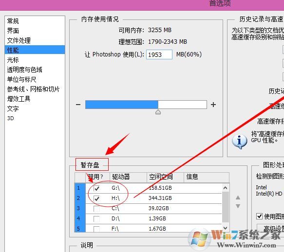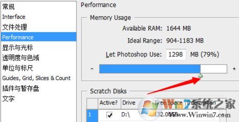2、在首选项框左侧中切换到performance 选卡,按下图面进行设置,设置完成后点击确定保存设置;