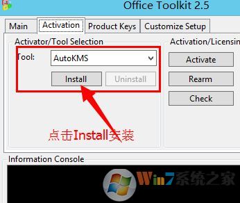 3、按需KMS ,在Tool后面下拉菜单选择:AutoKMS,然后点击Install进行安装KMS