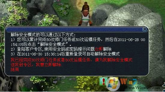 进入安全模式5天以上,且在游戏中累计完成50个师门任务或者50次运镖任务,即可点击游戏界面中的”绿色感叹号“解除安全模式。