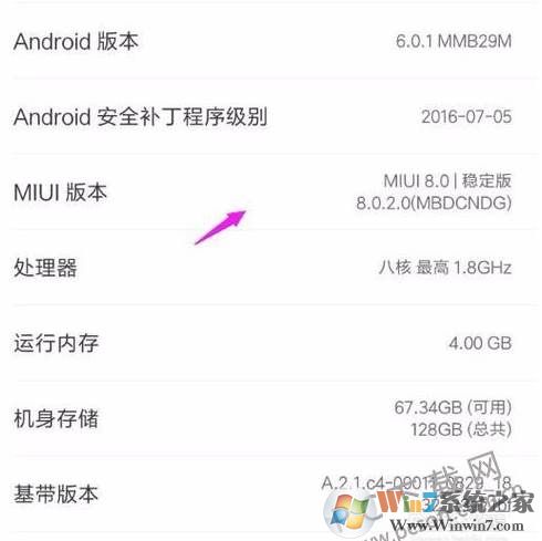 3.之后,我们在打开的页面中能够看到一些关于手机的信息,我们需要在里面找到一个MIUI版本的地方,在上面连续点击5次以上。(下图箭头指向处)