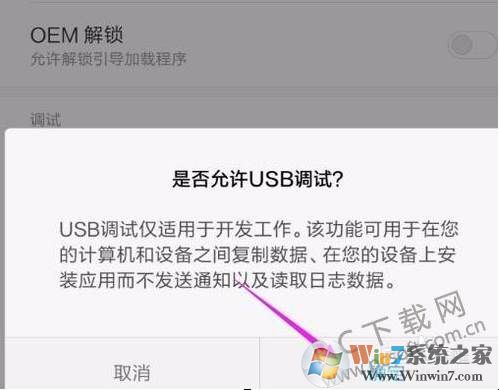 6、出现是否允许USB调试,我们选择允许,之后就可以打开usb调试了。
