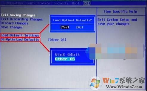 2、进入BIOS设置界面后,按下键盘上键将菜单移动至EXIT项目,按下键盘上按键选择到OS Optimized Defaults选项,按下回车键打开该选项的设置菜单,按下键盘上按键,将该选项默认的Win8 64bit修改为Others之后,按下回车键确认。之后按下键盘上按键选择到Load Default Setting选项,按下回车键启动恢复BIOS默认功能窗口,在该窗口中直接按下笔记本键盘上的回车键启动BIOS恢复默认功能。之后再按下笔记本键盘上Fn键+F10键启动BIOS保存设置窗口,在该窗口中直接按下笔记本键盘上的回车键启动BIOS保存设置并重新启动计算机。(这一步骤一些电脑无需设置。)