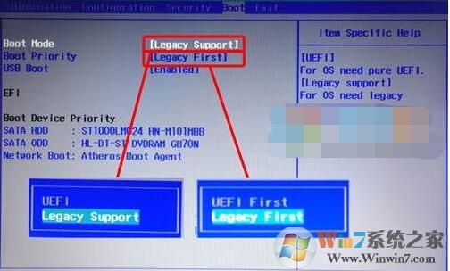 (或者请您在计算机重新启动至Lenovo LOGO画面时按下笔记本的电源开关关闭计算机之后,按下一键恢复按钮开机,按下键盘上按键选择启动菜单中的BIOS Setup项目之后按下回车键进入引导设置界面)将按下键盘上键菜单移动至项目,找到该项目下的Boot Mode选项,按下回车键打开该选项的设置菜单,按下键盘上按键,将该选项默认的UEFI修改为Legacy Support之后按下回车键确认,再按下键盘上按键选择Boot Priority选项,按下键盘上按键将该选项默认的UEFI First修改为Legacy First之后按下回车键确认。之后再按下笔记本键盘上的Fn键F10键启动BIOS保存设置窗口,在该窗口中直接按下笔记本键盘上的回车键启动BIOS保存设置并重新启动计算机功能。