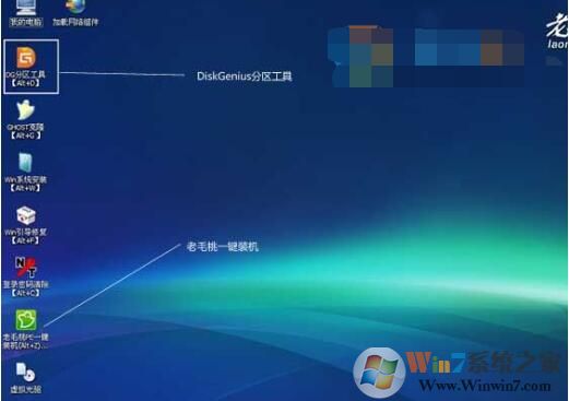 2、进入WINPE后,我们需要给磁盘进行重新分区,因为linux和Win7使用硬盘模式及分区不同,所以要重新分区,并改为MBR模式,在桌面上找到Diskgenius 分区工具运行;