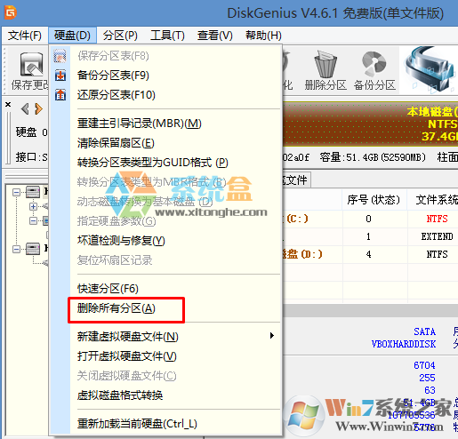 3、打开Diskgenius后,选择笔记本硬盘,然后点击“硬盘”——“删除所有分区“,删除前确保资料已经转移,删除后,点击保存更改;