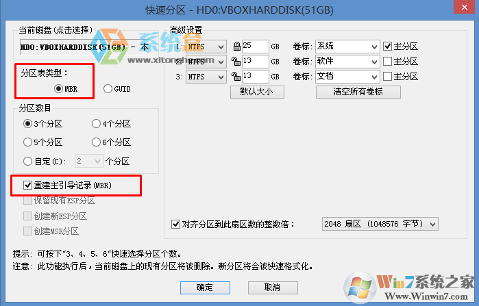 5、转换完成后,执行快速分区,分区大小几磁盘个数自己选择,确保分区表类型为MbR ,及勾选了重建主引导记录MBR,按下确定后开始分区;