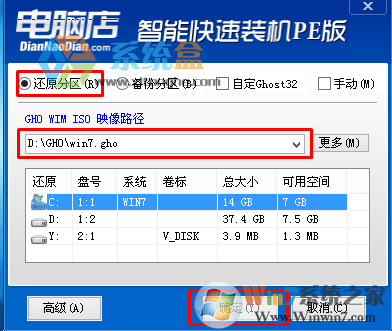 6、分区完成后,就可以开始安装Win7系统了,运行桌面上的 一键装机或 onekey ghost 等如下图,选择Win7.GHO,选中C盘,然后确定就可以开始安装过程;