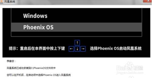 软件很贴心,给用户的提示,重启后选择phoenix os进入安装凤凰系统