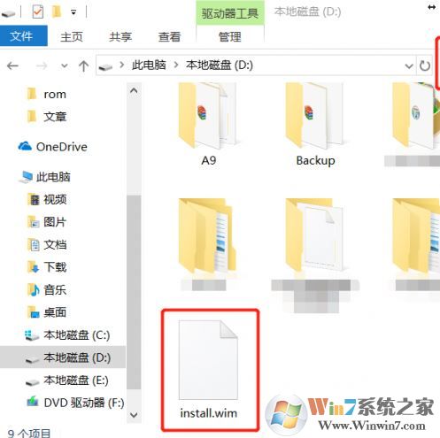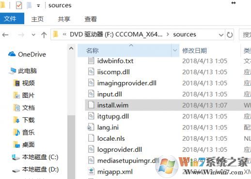 3、将install.wim复制到某个盘符的根目录下,小编这里放在D盘,拷贝完毕请自行改名,比如改成WIN10x64.wim等等。