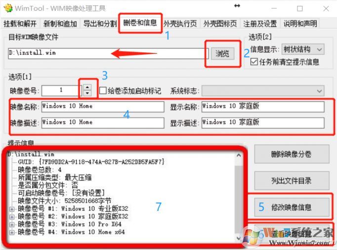 4、运行WimTool.exe,按照小编图中提供的操作顺序执行,其中第二步是选择拷贝到D盘并改名的镜像*.wim文件。然后,跟着小编的提示一步步检查、修改镜像,步骤1和2选中镜像文件后(如Win101803.wim),步骤3映像卷号会切换这个*.wim文件内的不通版本系统,选择自己要集成到新*.wim文件的系统后,在提示4处定义自己需要的名称(集成到新的*.Wim文件后方便识别)。注意,这里一定要记住要提取的卷号系统版本是几(步骤3)!