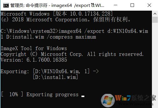 7、在命令提示符模式下,输入命令imagex64 /export d:WIN10x64.wim 1 d:install.wim /compress maximum。注意,这个命令小编要特别说一下,imagex64或者imagex都可以,这是32/64位命令符工具的选择问题。然后就是d:WIN10x64.wim,盘符是之前提取*.wim后的位置,WIN10x64.wim就是修改命名后被即将被提取的对象,d:install.wim则是合成后的镜像名称,不要搞错。这个命令合并起来解释就是,把保存在D盘的WIN10x64.wim中卷号为1的系统添加到新的install.wim文件中。如果有多个需要提取合成到新*.wim中就继续输入,区别就是卷号了(1那里),如下图所示: