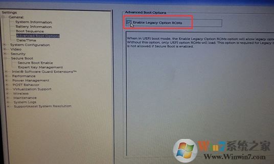 2、切换到Advanced Boot Options将右边的Enable legacy option roms选项打勾,如下图所示;