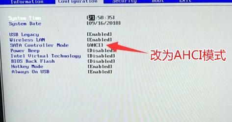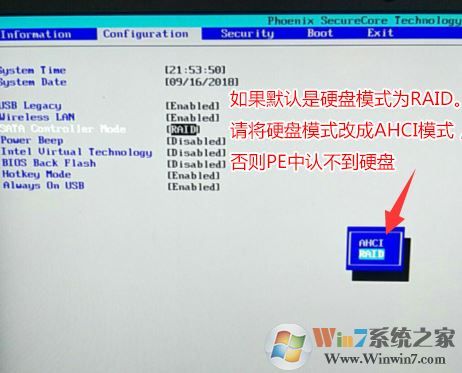 6、注意:再返回configuration这项,查看sata controller mode这项,如果默认硬盘模式为RAID,请将硬盘模式改为AHCI模式,否则进PE后不能认出硬盘,如果更改后记得按F10保存,如下图所示;