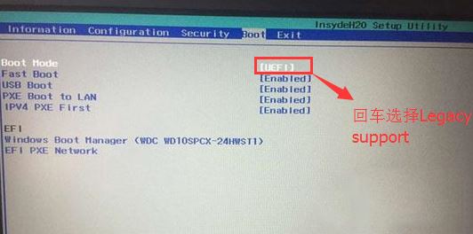 4、切换到Boot,把Boot Mode从UEFI改成Legacy Support;