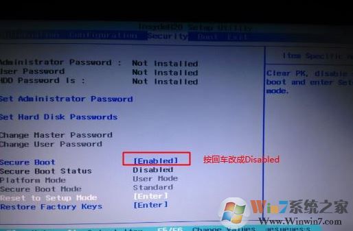 1、开机一直按F2或(FN+F2)进入BIOS,按→方向键切换到Security,选择Secure Boot回车设置成Disabled;
