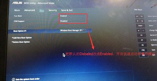 2、重启后切换到BOOT的选项,分别把fast boot和csm support由disabled改成enabled,分别开启快速启动和兼容模式,如图:
