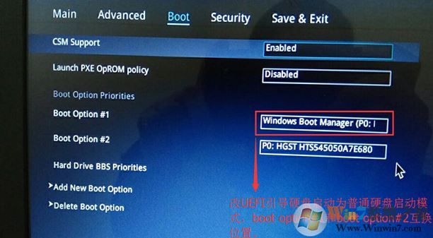 3、继续把boot option#1选项改为普通引导的,boot option#1和boot option#2硬盘启动位置对换,设置第一启动项为普通硬盘引导,带Windwos Boot Manager的为UEFI引导分区,如图: