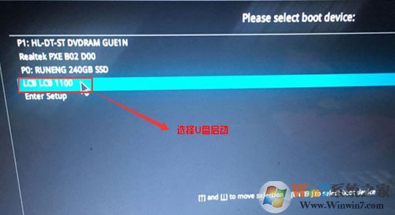 4、插入U盘启动盘,重启按ESC选择识别到U盘启动项,回车,如图: