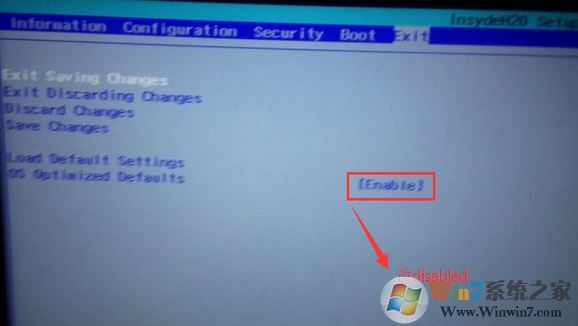 3、然后切换到Exit选,将os optimized defaults由默认的enabled改成disabled;