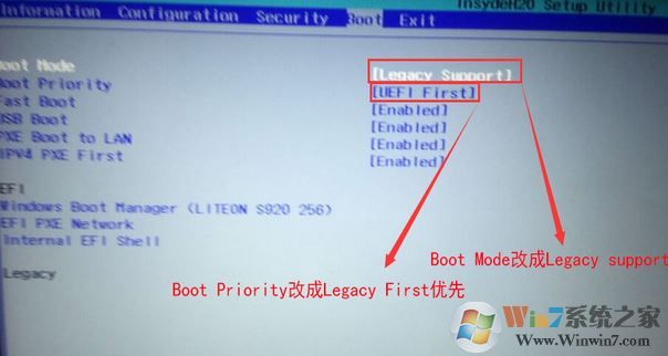 2、进然后切换BOOT的选项,将Boot Mode由默认的UEFI改成Legacy Support,再将Boot priority默认UEFI first改成Legacy firt,改legacy普通引导优先;
