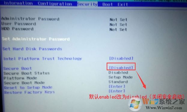 1、开机一直按F2进入BIOS,,切换到Security选项将Secure Boot默认enabled改成disabled,关闭安全启动;