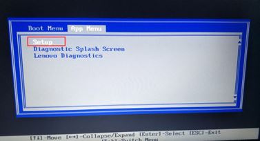 1、重启笔记本按F12,按TAB键切换栏目到"App Menu",然后选择"setup"进入BIOS设置,或是看到lenovo或ThinkPad标识后多次按Enter回车,听到报警声后等待下一画面,然后按F1或Fn+ F1进入BIOS主界面。如下图所示;