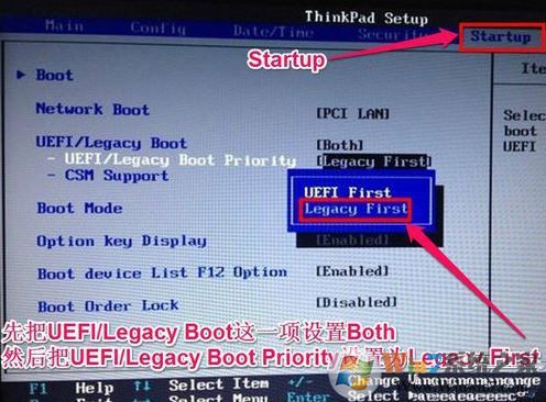 3、选择startup,在UEFI/legac boot priority下,设置为Legacy First(传统模式优先),如图: