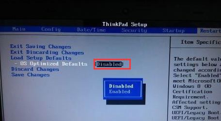 4、在Restart下,选择OS Optimized Defaults回车,改成Disabled或Other OS,接着选择Load Setup Defaults回车进行加载,然后按F10保存设置,如图: