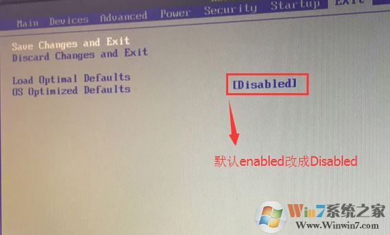2、转到Exit,把OS Optimized Defaults设置为Disabled;
