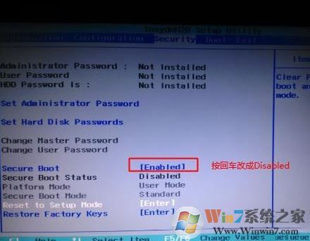 1、开机一直按F2或(FN+F2)进入BIOS,按→方向键切换到Security,选择Secure Boot回车设置成Disabled,如图: