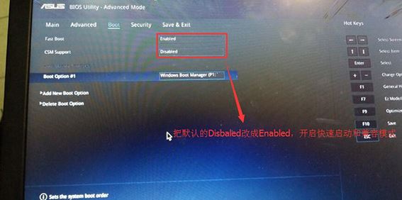 2、重启后切换到BOOT的选项,分别把fast boot和csm support由disabled改成enabled,分别开启快速启动和兼容模式;