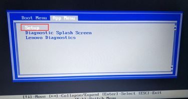 1、重启笔记本按F12,按TAB键切换栏目到"App Menu",然后选择"setup"进入BIOS设置,或是看到lenovo或ThinkPad标识后多次按Enter回车,听到报警声后等待下一画面,然后按F1或Fn+ F1进入BIOS主界面。如下图所示;