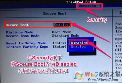 1、按→方向键移动到Security,将secure boot改成disabled,关闭安全启动,如下图所示;