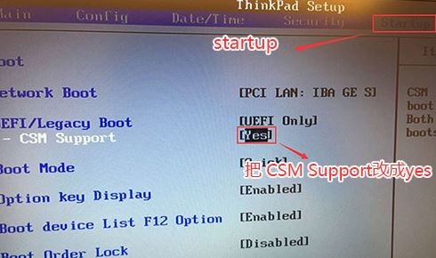 2、选择startup,把csm support,设置为Yes(开启兼容模式),如图: