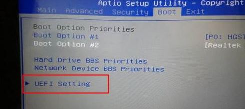 2、转到Boot界面,选择UEFI Setting回车,如图: