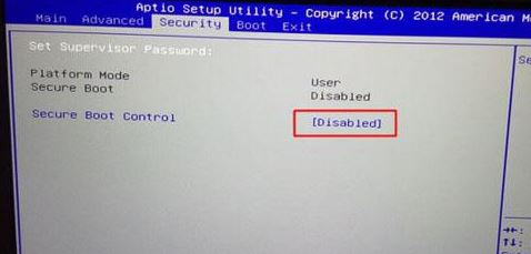 1、重启笔记本按F2进入BIOS设置,在Security下把Secure Boot Control设置为Disabled,如图:
