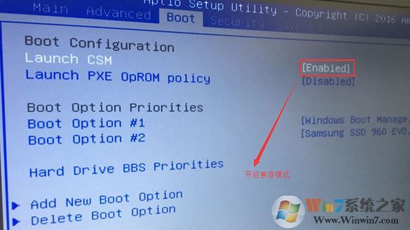 2、重启后切换到BOOT的选项,把Launch CSM由disabled改成enabled,开启兼容模式;