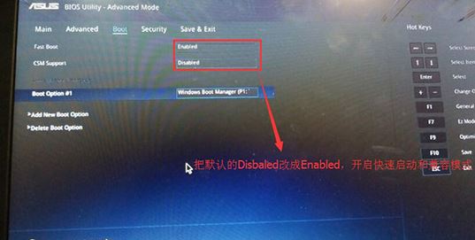 2、重启后切换到BOOT的选项,分别把fast boot和csm support由disabled改成enabled,分别开启快速启动和兼容模式;