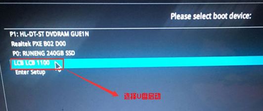 4、插入U盘启动盘,重启按ESC选择识别到U盘启动项,按下回车键,如图: