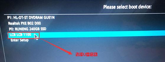 3、插入U盘启动盘,重启按ESC选择识别到U盘启动项,回车,如图所示: