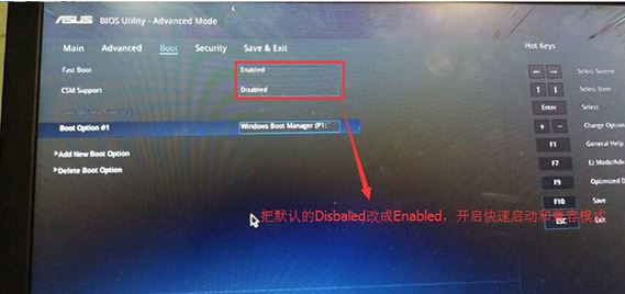 2、重启后切换到BOOT的选项,分别把fast boot和csm support由disabled改成enabled,分别开启快速启动和兼容模式,如图所示: