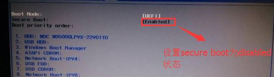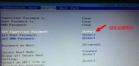 2、如果Secure Boot灰色无法设置,则转到Security,选择Set Supervisor Password回车设置密码,再返回BOOT选项,将Secure BOOT默认enabled为disabled,(注:改完secure boot后再设置密码为空即可,要不每次进BIOS都要设置)如下图所示;
