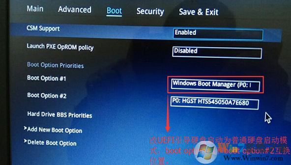 3、继续把boot option#1选项改为普通引导的,boot option#1和boot option#2硬盘启动位置对换,设置第一启动项为普通硬盘引导,带Windwos Boot Manager的为UEFI引导分区;