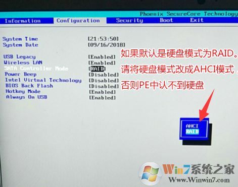 6、注意:再返回configuration这项,查看sata controller mode这项,如果默认硬盘模式为RAID,请将硬盘模式改为AHCI模式,否则进PE后不能认出硬盘,如果更改后记得按F10保存,如下图所示;