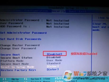 1、开机一直按F2或(FN+F2)进入BIOS,按→方向键切换到Security,选择Secure Boot回车设置成Disabled;