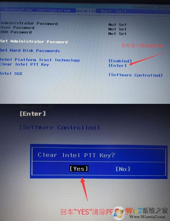 注:按如果Security选项下没有Secure Boot选项,看下是否有"clear intel PTT Key"选项,如果有进入回车选选择“yes”清除ppt key,否则无法安装系统后无法引导启动,如下图所示;