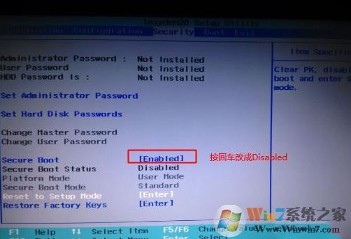 1、开机一直按F2或(FN+F2)进入BIOS,按→方向键切换到Security,选择Secure Boot回车设置成Disabled,关闭安全启动,否则安装win7会失败,如下图所示;