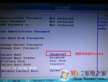 1、开机一直按F2或(FN+F2)进入BIOS,按→方向键切换到Security,选择Secure Boot回车设置成Disabled;