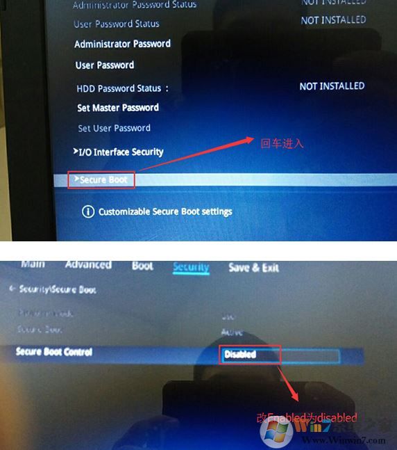 1、重启笔记本按esc进入BIOS设置,然后按F7进入高级模式,按→方向键移动到Security,选择Secure Boot,然后回车进入把Secure Boot control选enabled改为disabled关闭安全启动,然后按F10保存重启;
